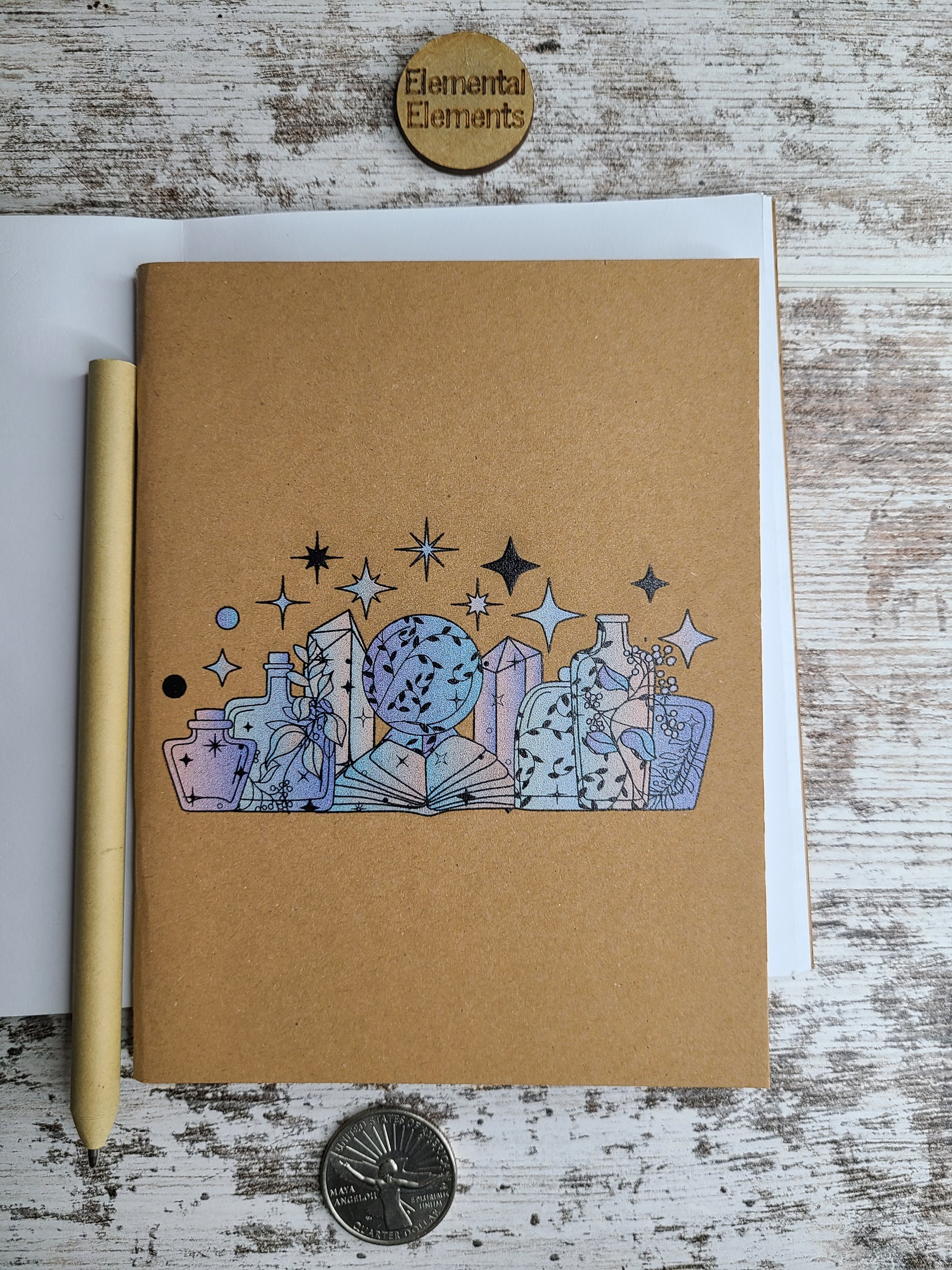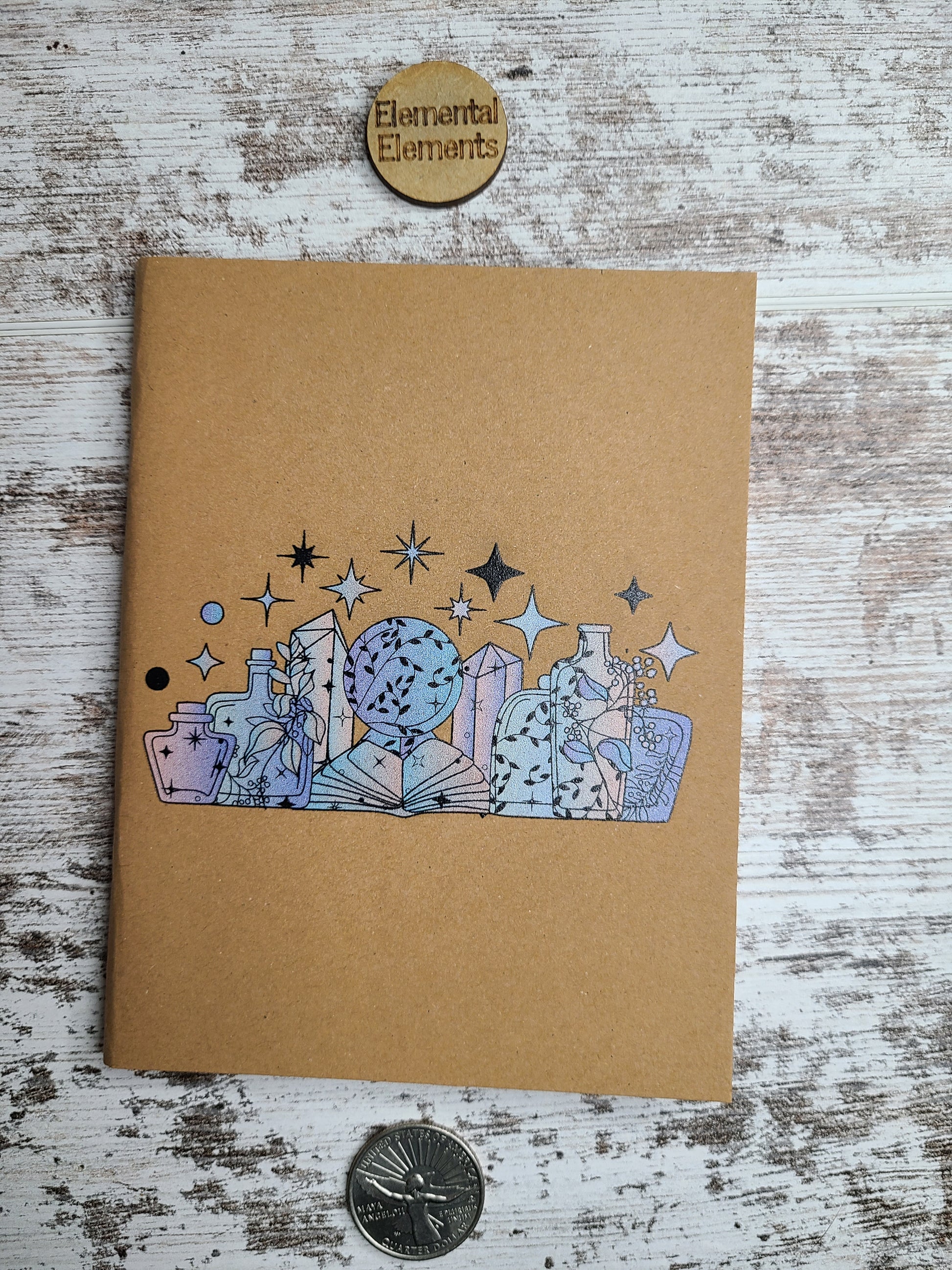 Apothecary journal with a spell book, crystal obelisks, herb jars, and crystal ball. Each journal is 4.25 by 5.5 in, and 120 GSM paper with 48 blank pages inside. Perfect for creating spells or jotting down thoughts.