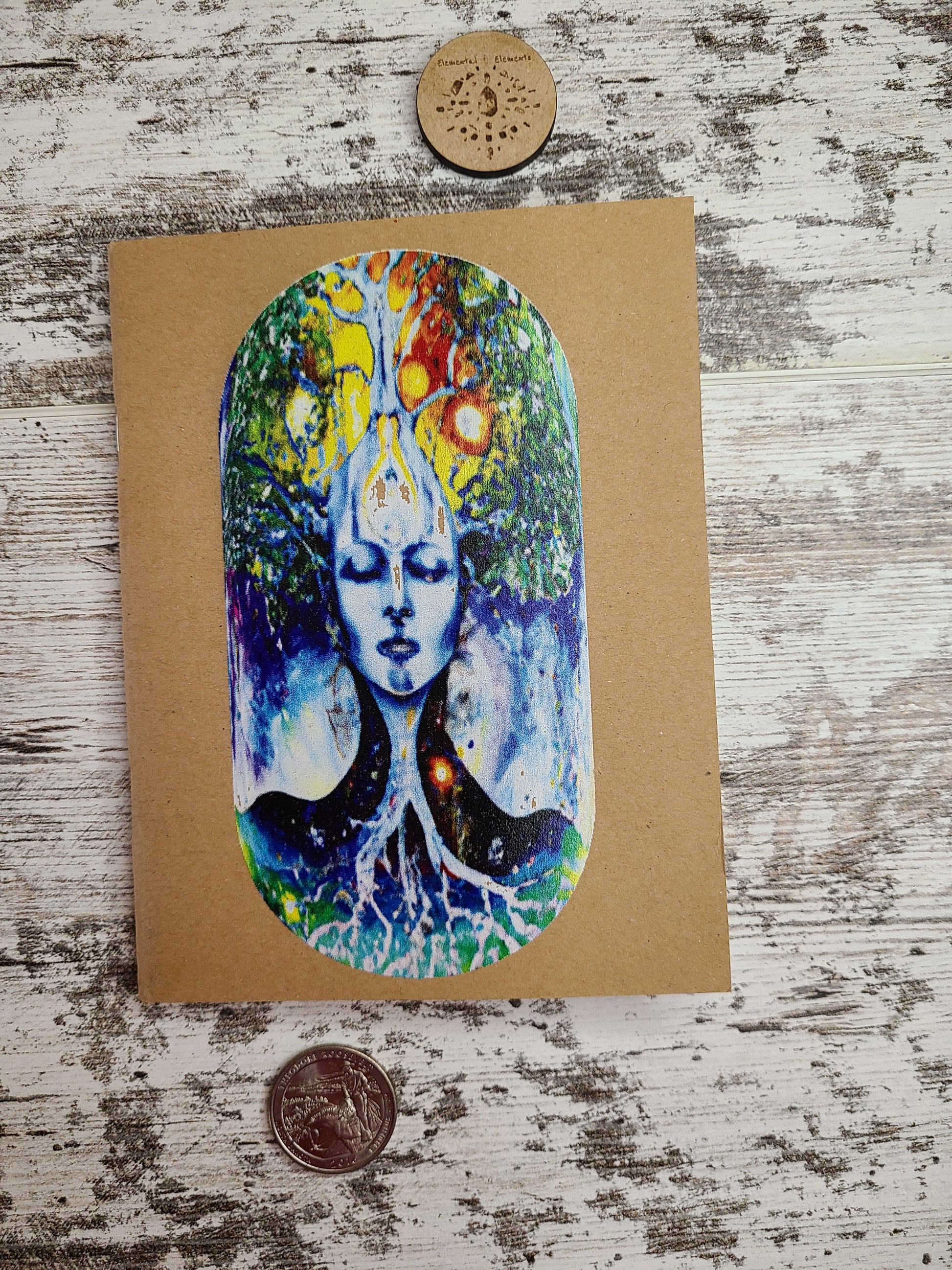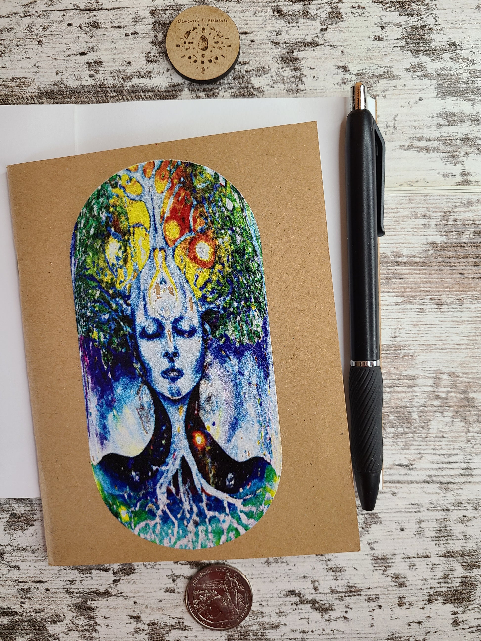 Connected Tree of Life Journal Notebook. Each journal is 4.25 by 5.5 in. and 120 GSM paper with 48 blank pages. Rainbow colored tree in bloom, face in trunk and leaves growing out from the branches. Allow this unique one-of-a-kind Art to inspire you and frame it when you have filled your pages!