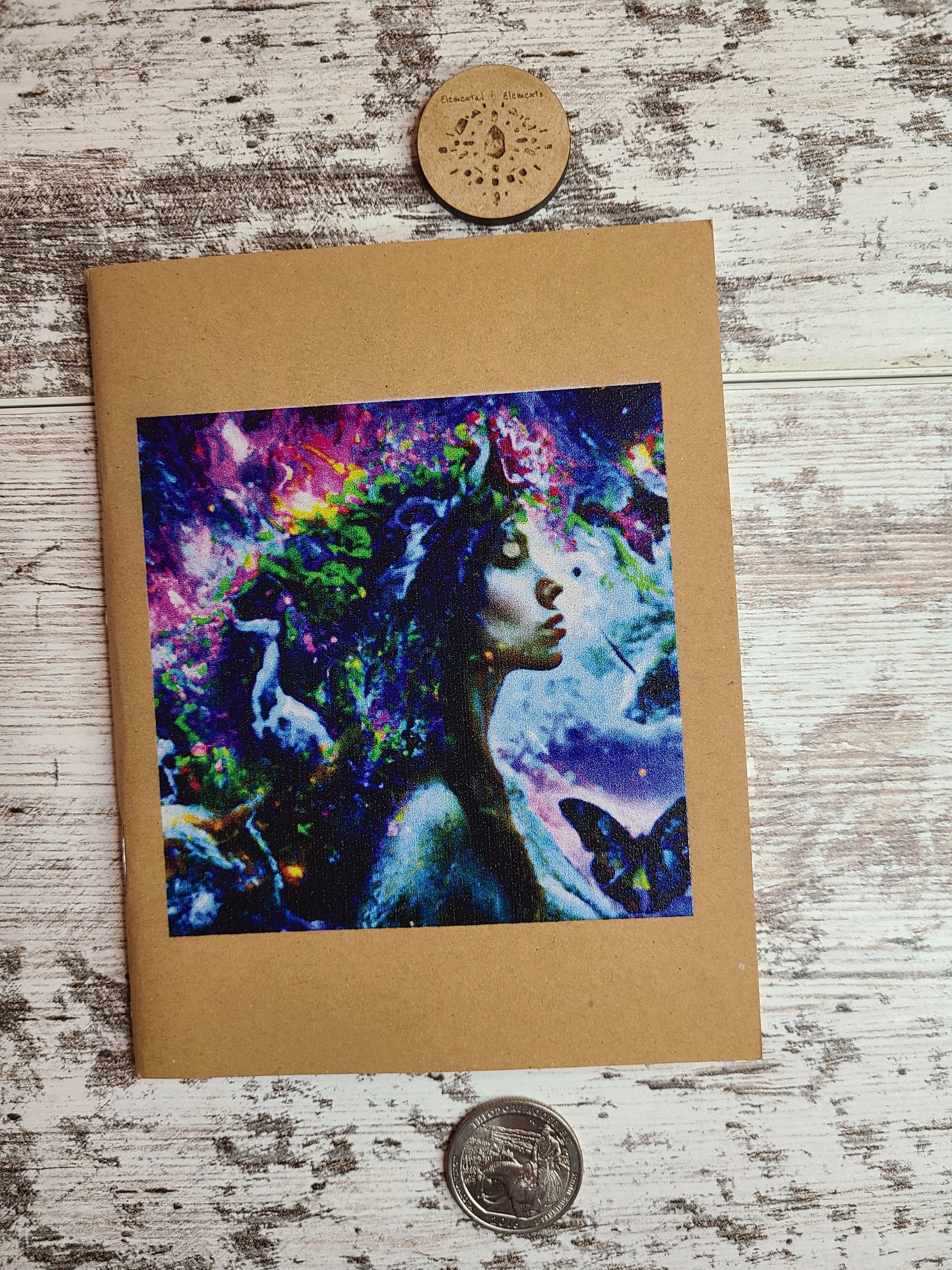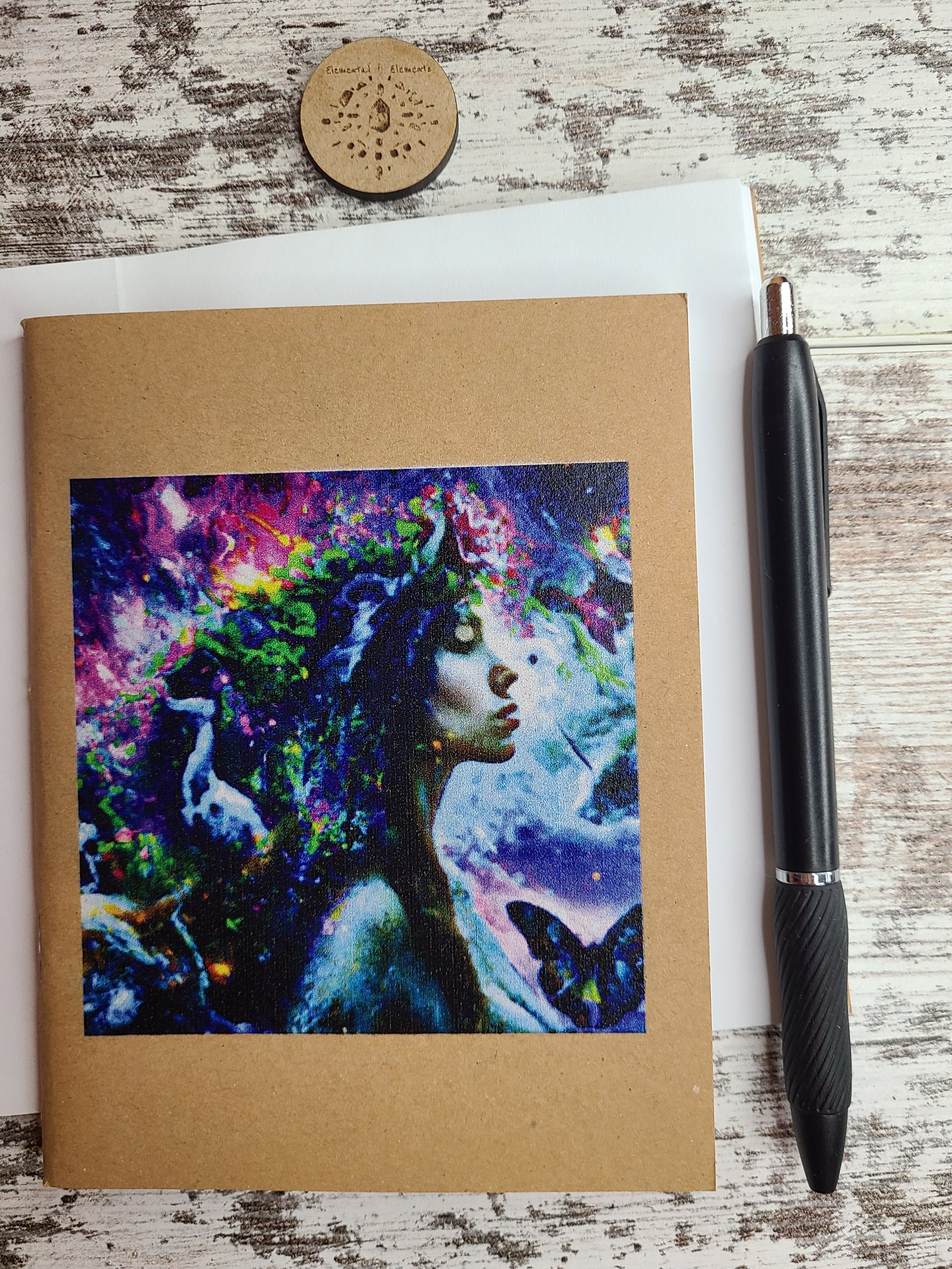 Our Energy Goddess Journal Notebook is full of rainbow colors. Shades of green, blue, purple, yellow, pink, black, red, and orange dance across the cover making up a beautiful Goddess, Butterfly, and moss/wispy "cloud" display. This journal is an absolute feast for the eyes.