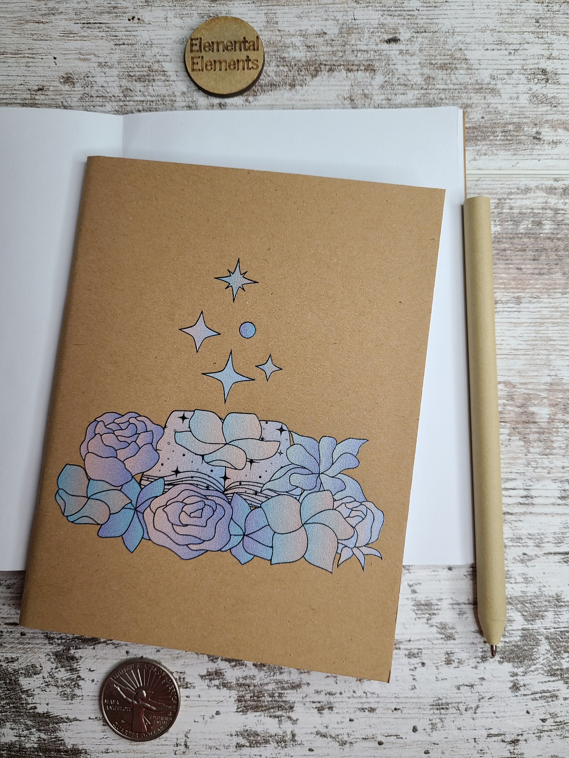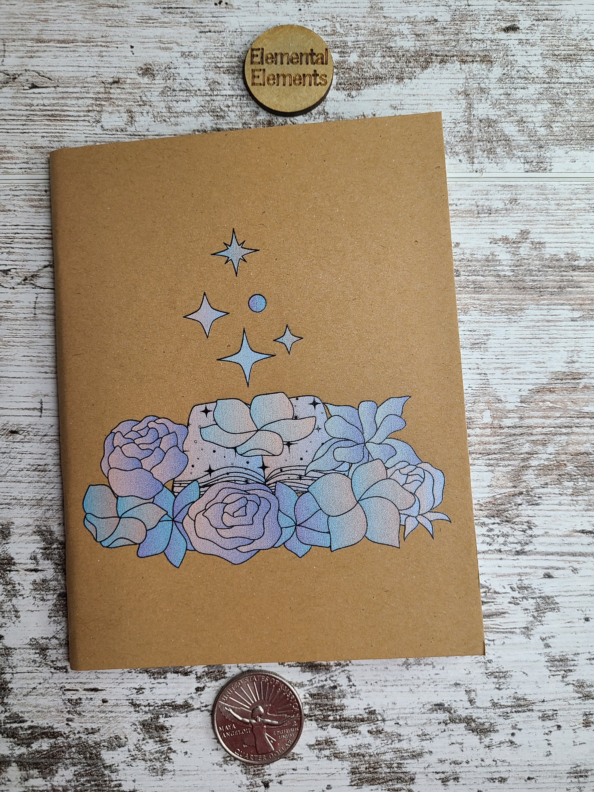 I absolutely love the mix of pastel colors in our Ritual journal. It beautifully depicts the specialness of a ritual with preparation and flowers. Even a little bit of magick coming up from the center.